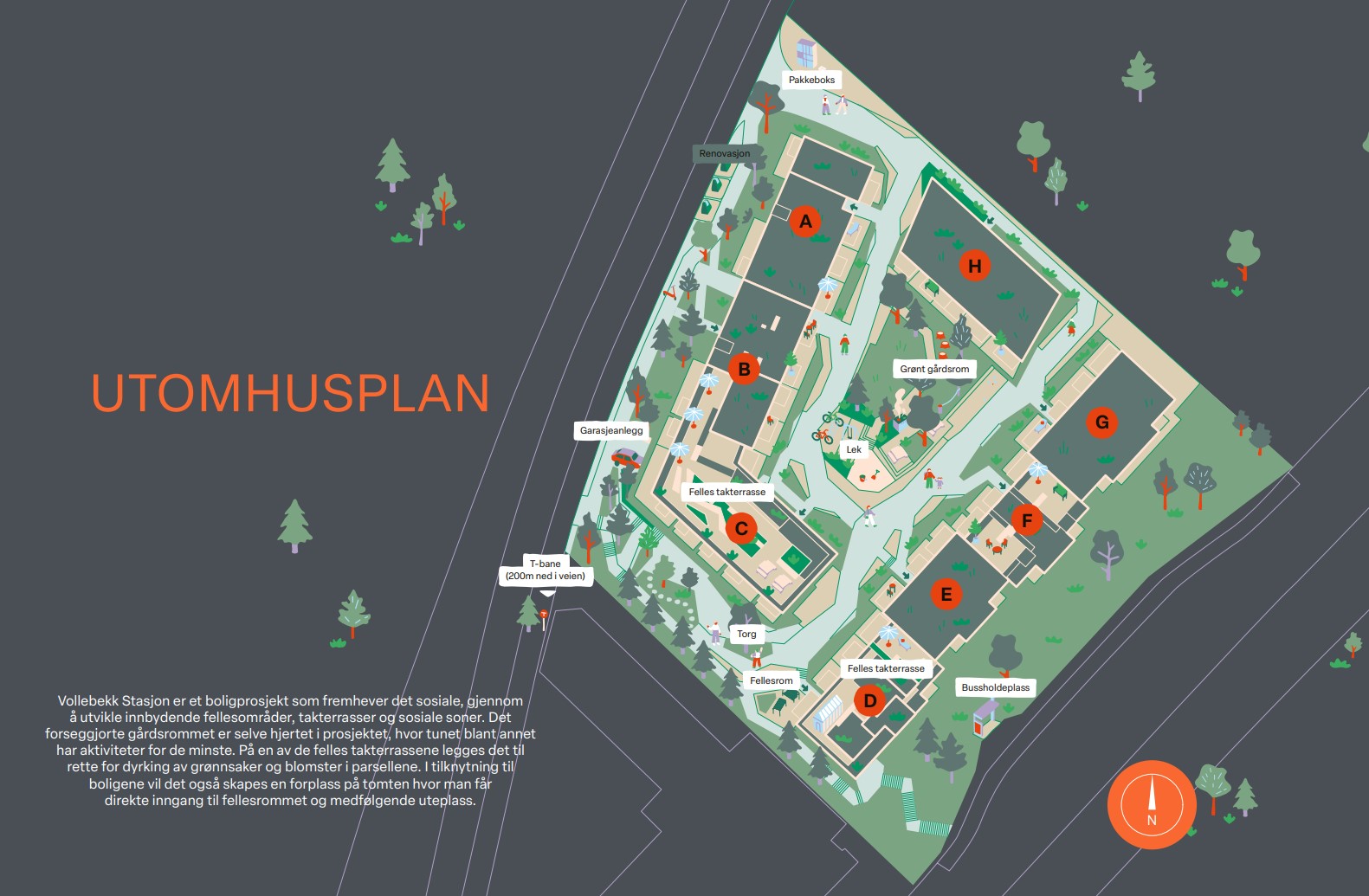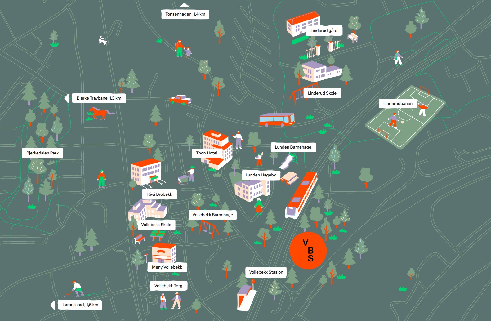 Vollebekk er et område i sterk vekst. Plassert mellom sentrum og marka har Vollebekk det beste fra begge verdener. Når du er hjemme her, er du i nærheten av alt. Barnehager, skole og kulturhus, idrettsfasiliteter og T-bane, er alt i gangavstand fra Vollebekk Stasjon. Her finner du kombinasjonen av det grønne og moderne, midt i et område som vokser og blir stadig mer sentralt.