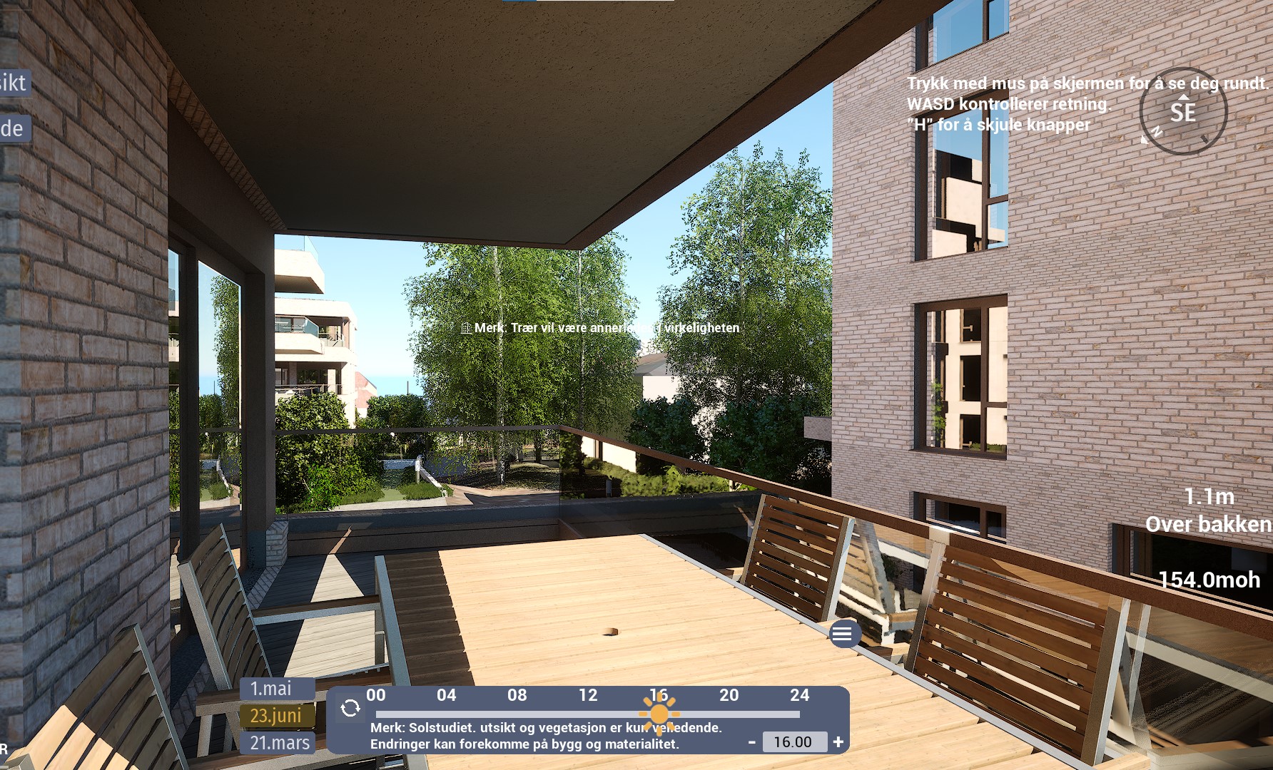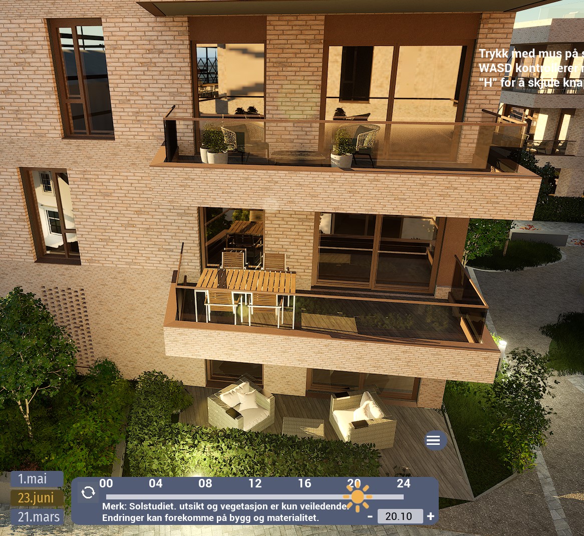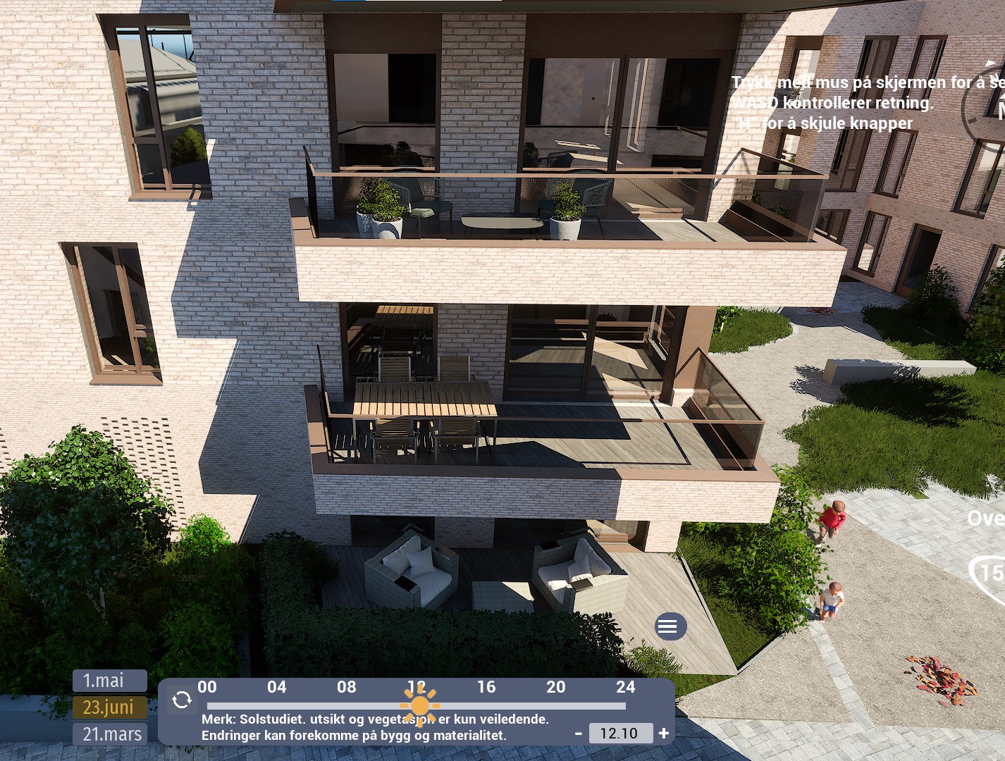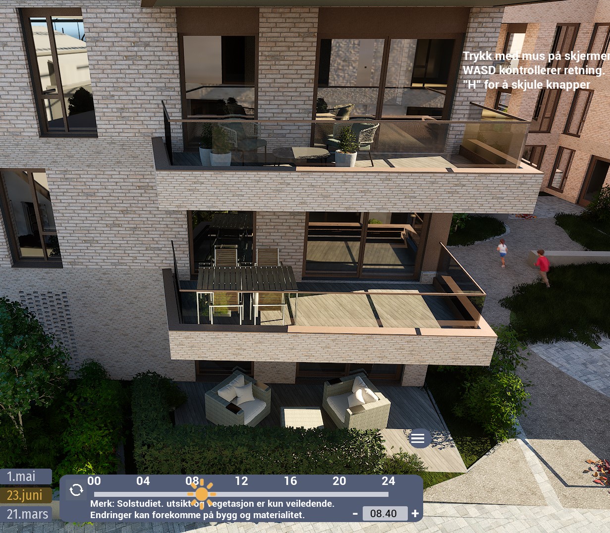 Denne leiligheten har en sørvendt balkong på hele 12,5 m². Ifølge simulator er det det sol fra rundt 08:30 til 12-tiden. Etter et lite opphold, kommer solen tilbake rundt 15:30-tiden og forsvinner til slutt rundt 20-tiden. Oppgitte tider er midtsommers. Avvik kan forekomme.