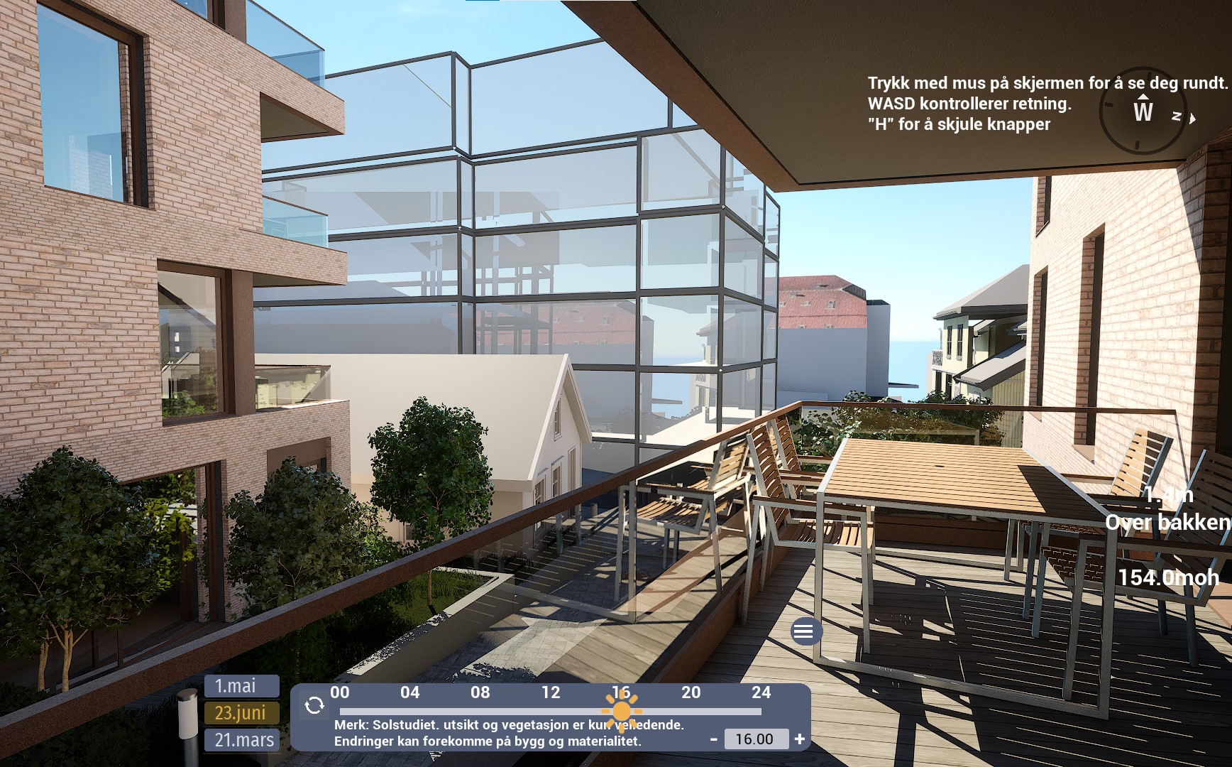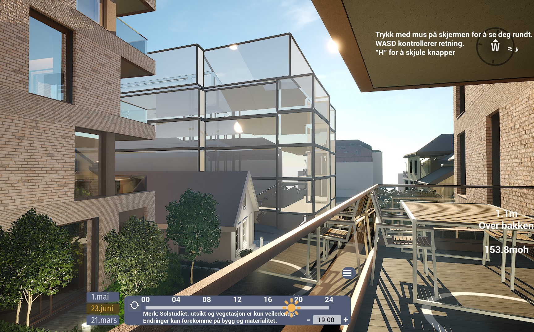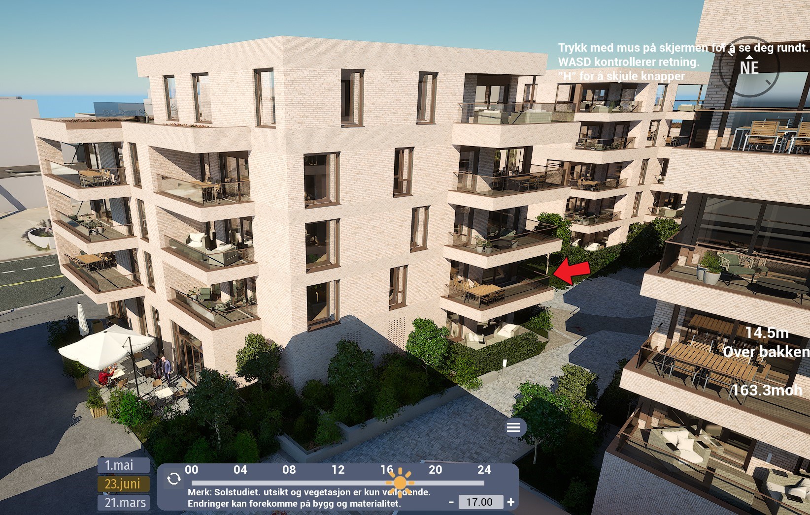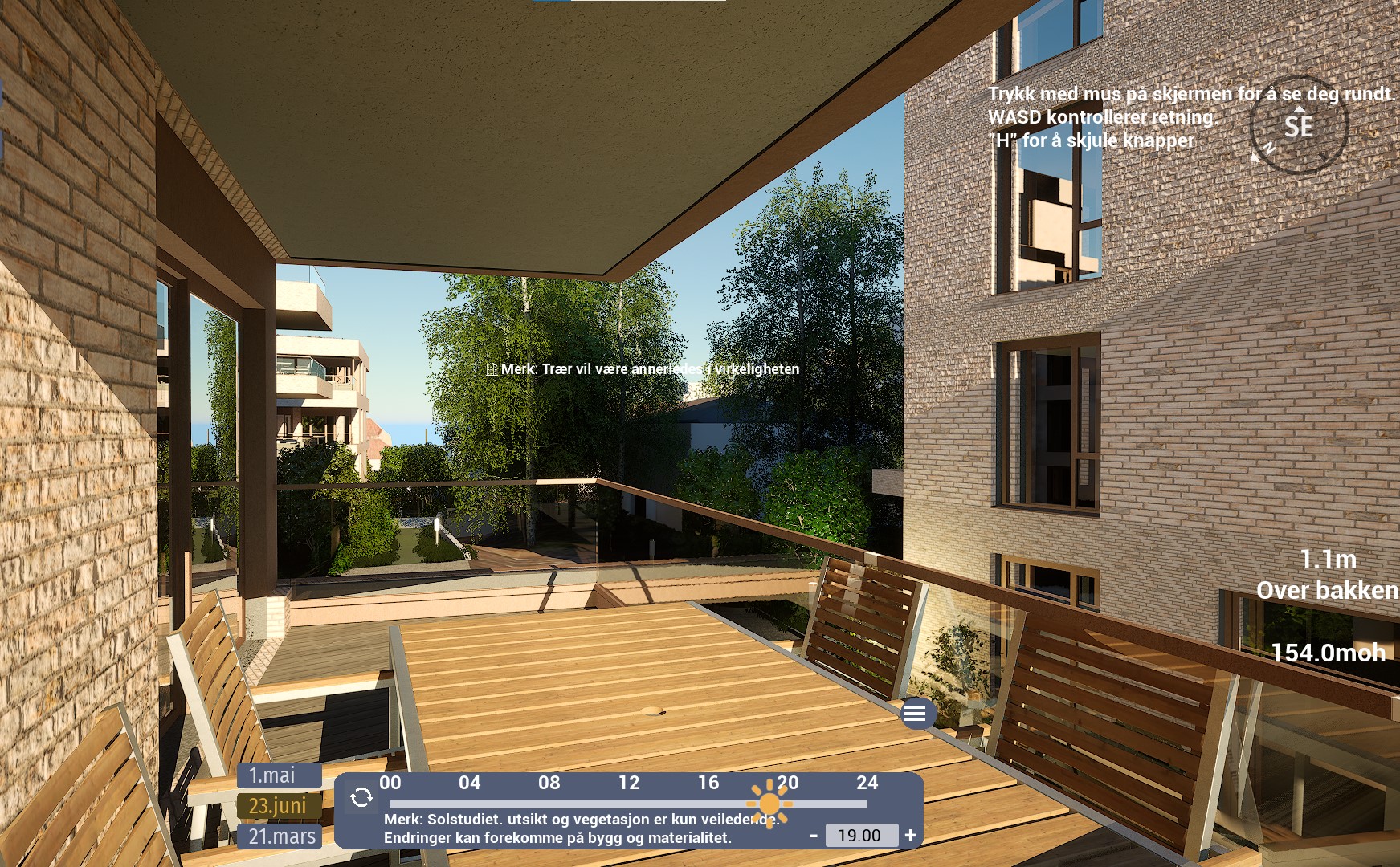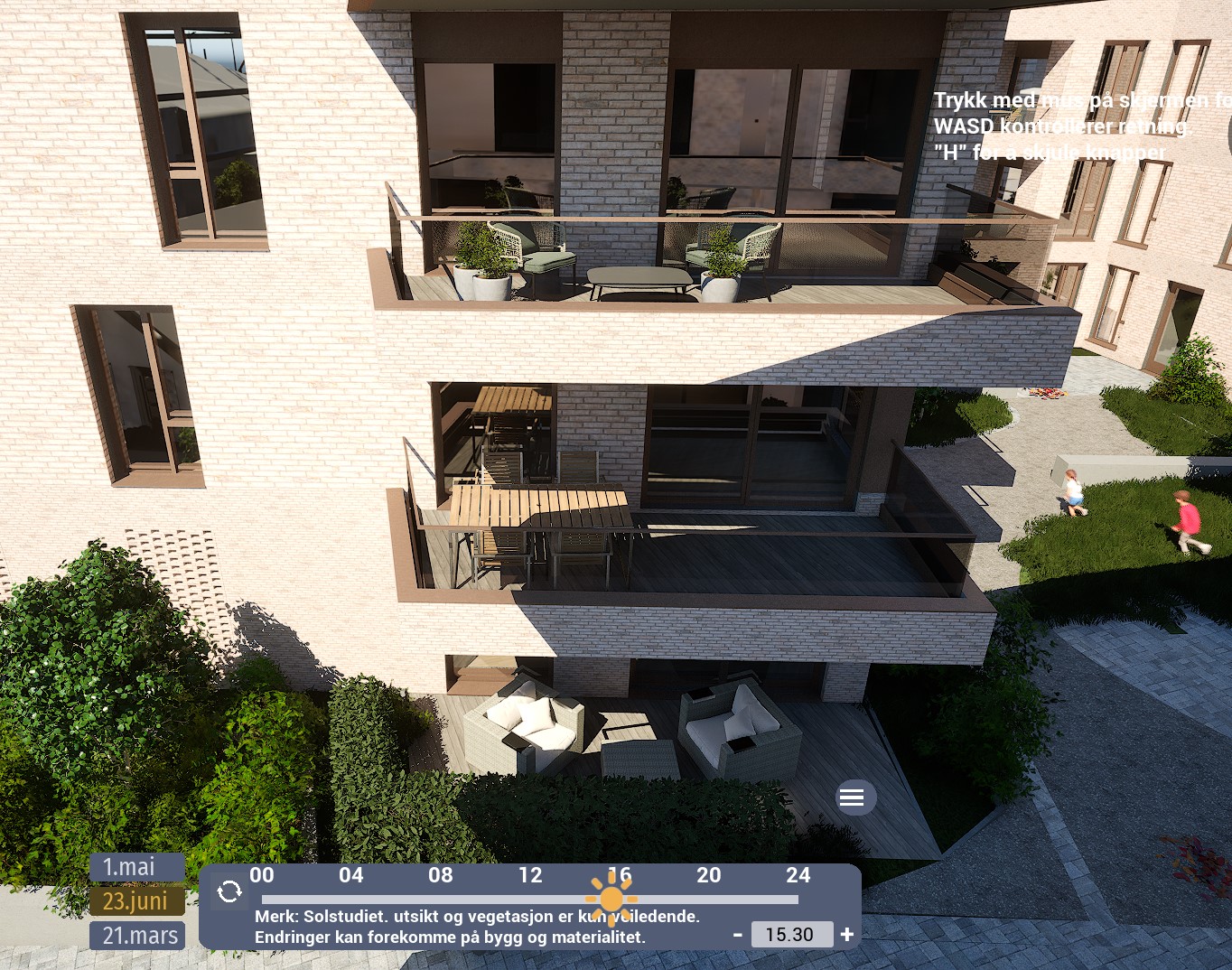 Denne leiligheten har en sørvendt balkong på hele 12,5 m². Ifølge simulator er det det sol fra rundt 08:30 til 12-tiden. Etter et lite opphold, kommer solen tilbake rundt 15:30-tiden og forsvinner til slutt rundt 20-tiden. Oppgitte tider er midtsommers. Avvik kan forekomme.