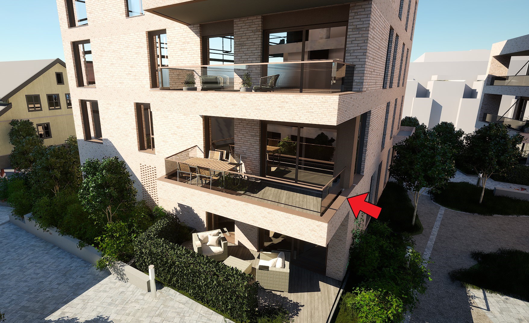 Balkonger og terrasser leveres med tremmegulv (terrassedekke i tre). Klart glassrekkverk over en lav teglbrystning på utside av balkong, platekledt mot innsiden av balkongen og u-profil håndløper på toppen av glasset. Det leveres typisk 1 stk. LED utelampe med dobbel stikkontakt, og bryter på innsiden. Antall på større takterrasser avklares av ARK og fremgår på elektrotegning. Undersiden av balkongen er i betong. Vannuttak ved hvert hovedinngangsparti og på takterrasser. Inspeksjonsluke på innsiden av veggen for godkjent fuktsikring.