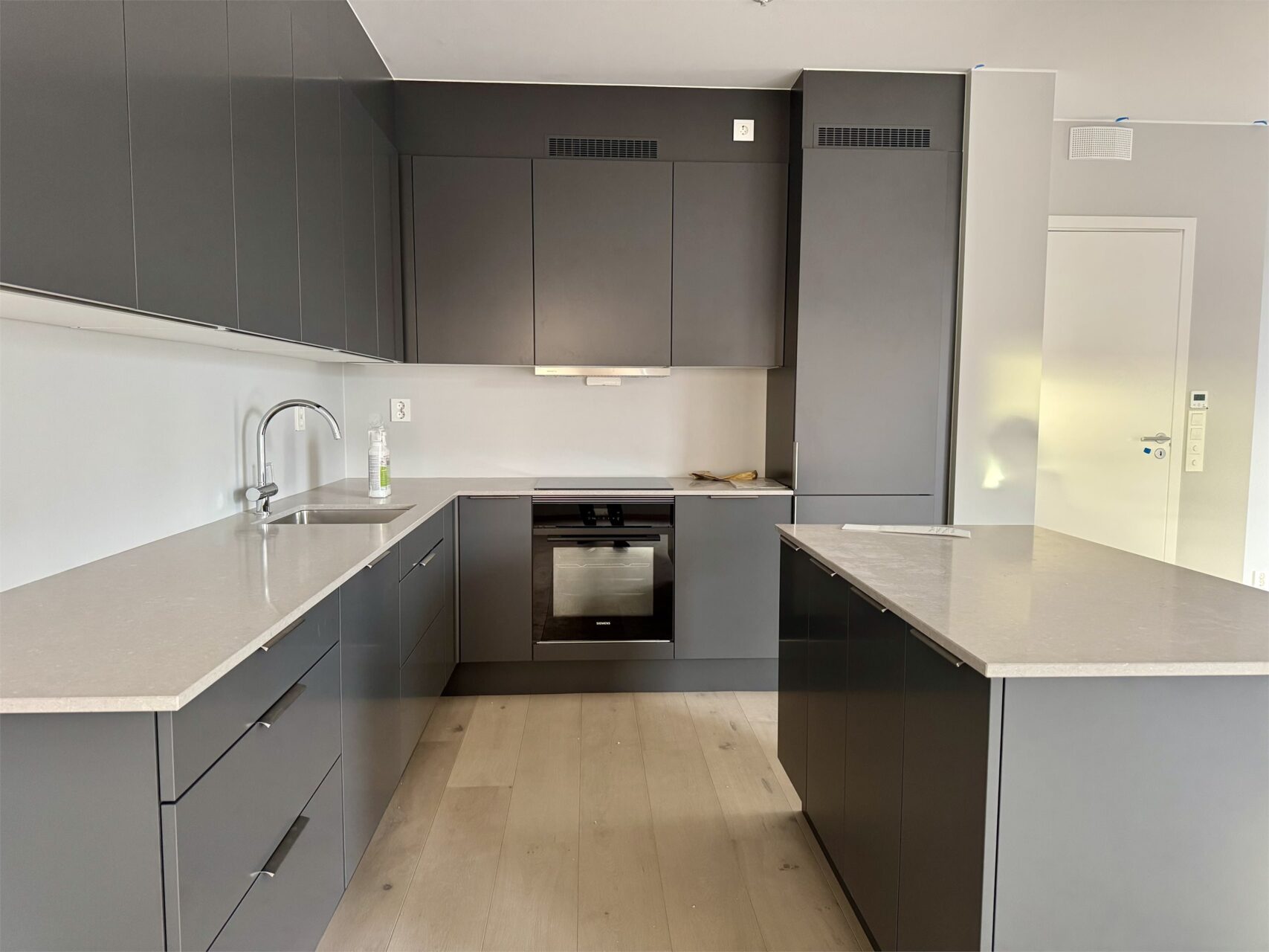 Det leveres hvitevarepakke fra Siemens bestående av innbyggingsovn med pyrolyse, 60 cm induksjonstopp, integrert kombiskap og oppvaskmaskin.