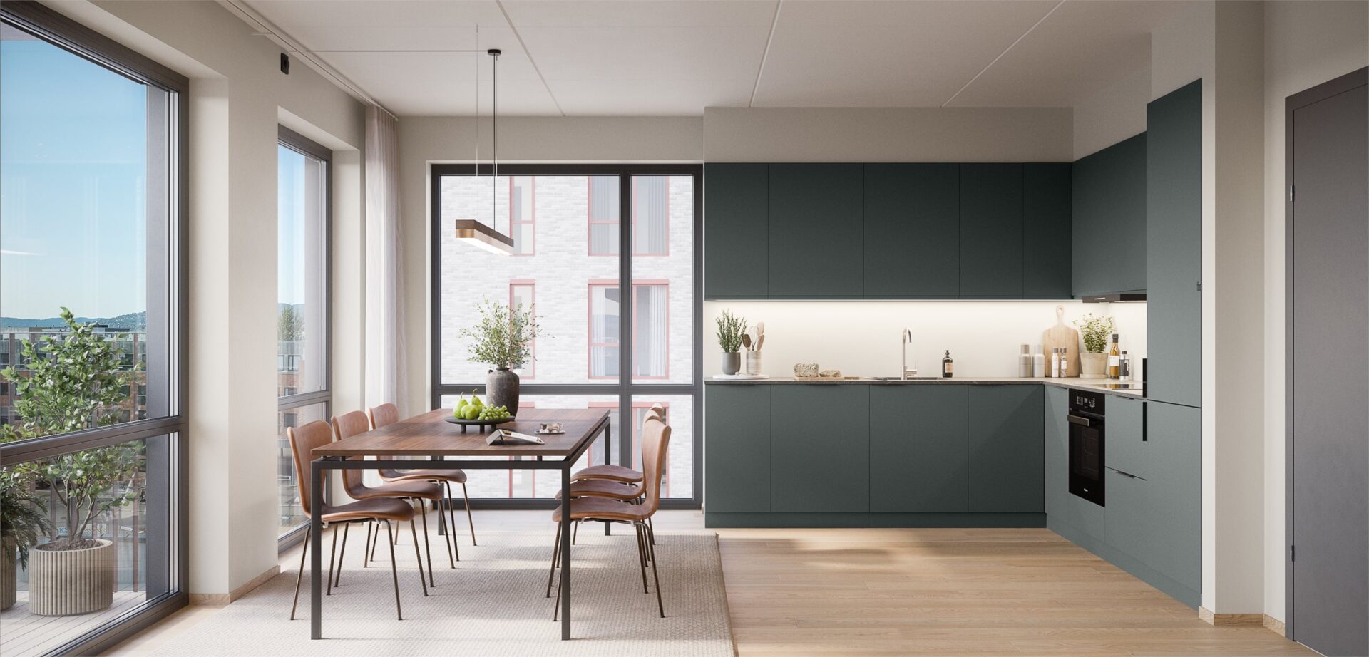 Det leveres kjøkkeninnredning fra HTH modell ES Base. Spesifisert tegning og beskrivelse av kjøkken vil bli utarbeidet for hver enkelt leilighet i forbindelse med tilvalgsprosessen. Det gjøres oppmerksom på at volumet ovenfor overskap vil måtte bli benyttet til fremføring av ventilasjonskanaler og derfor ikke kan benyttes som skapplass. Det leveres ikke hvitevarer, men hvitevarepakker kan bestilles som tilvalg. Plassering av teknisk utstyr i kjøkkenet er ikke endelig besluttet, og kan avvike fra hva som vises på salgstegninger.
