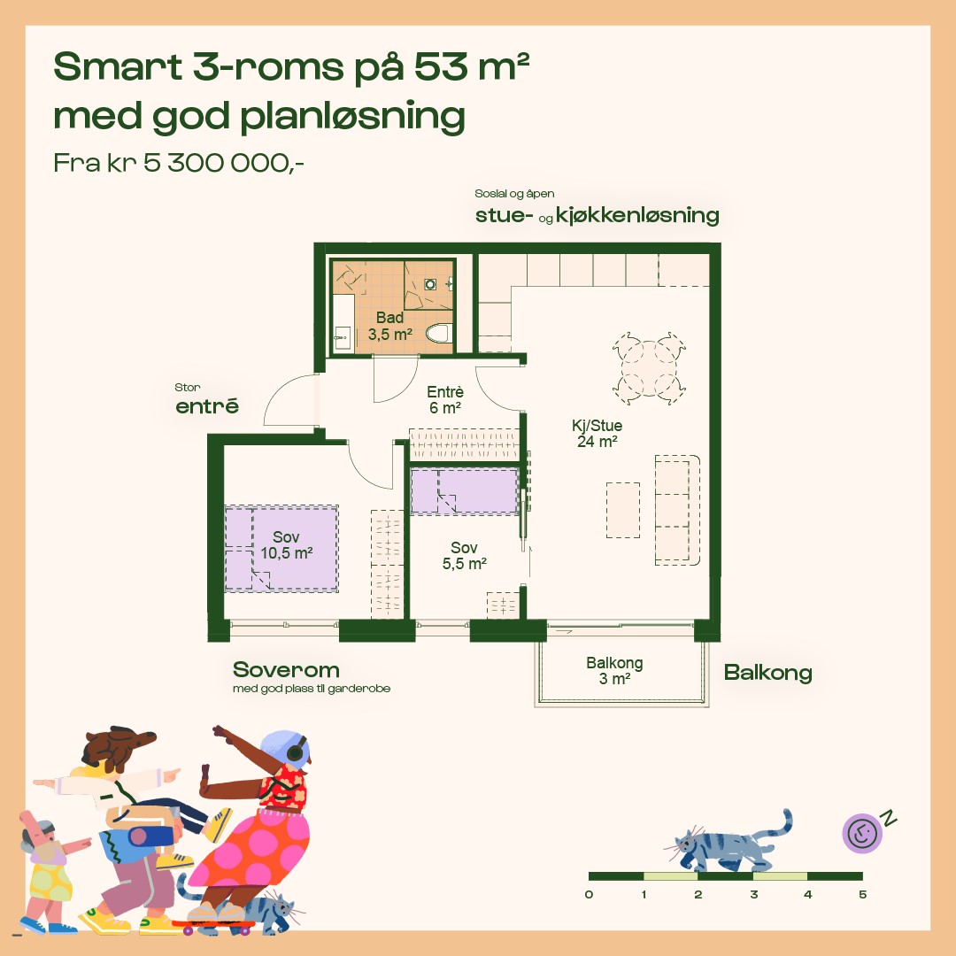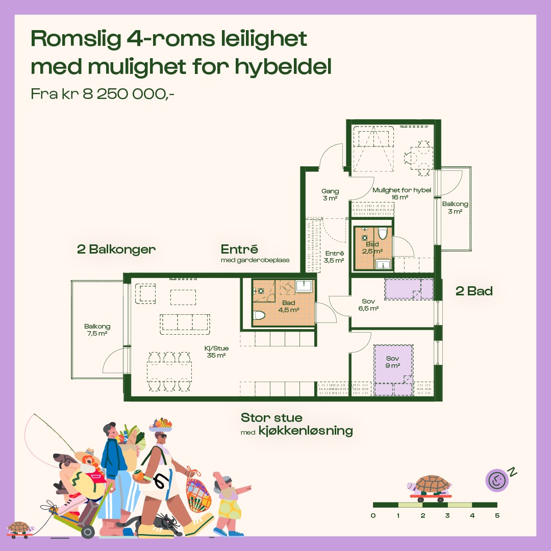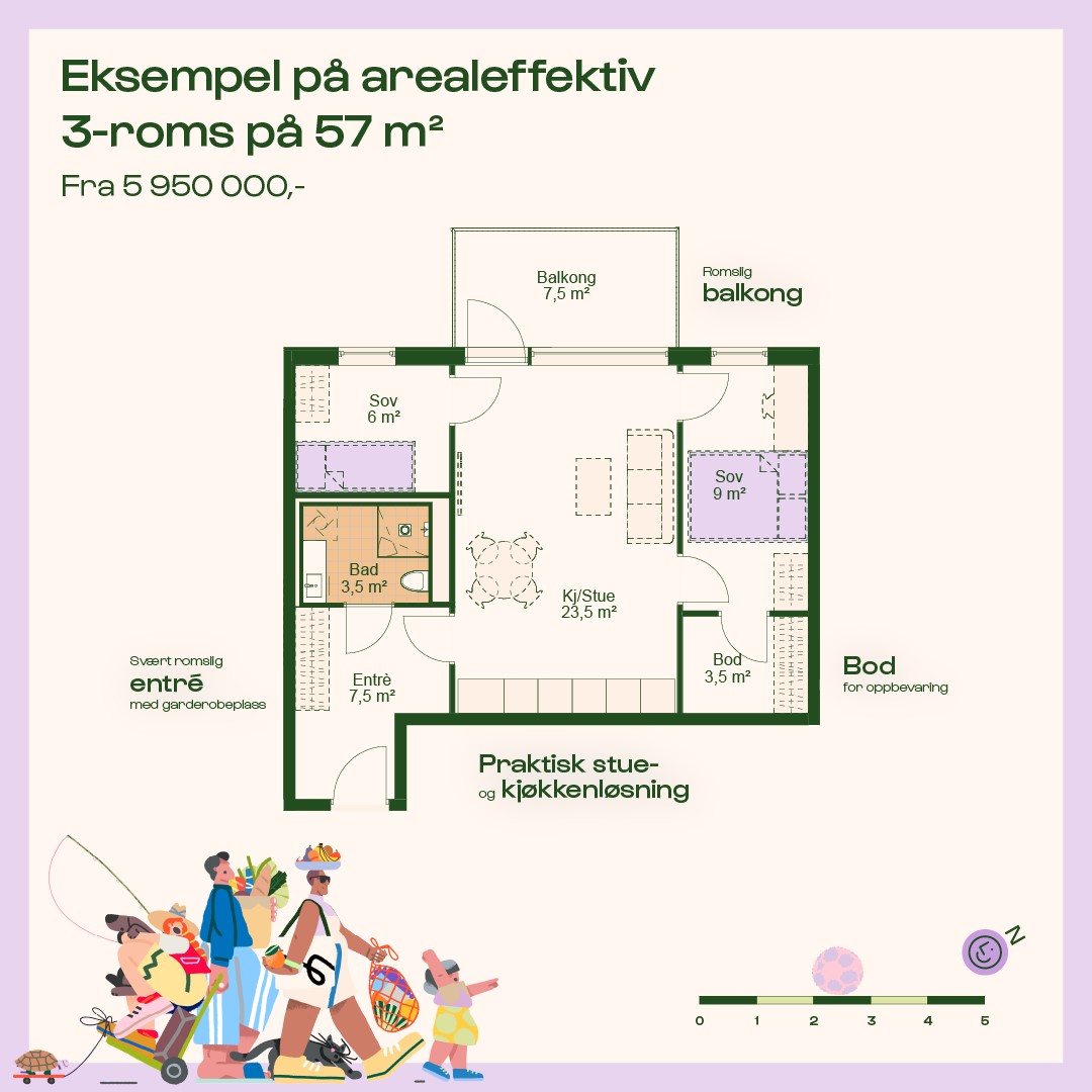For å tilrettelegge for flest mulig, kommer det moderne og urbane boliger i ulike størrelser og prisklasser. Mange av leilighetene er tilpasset førstegangskjøpere, med arealeffektive 1-roms fra 30 kvm og smarte 2-roms på 35 til 42 kvm, samt kompakte 3-roms leiligheter på ca 55 kvm for de som ønsker å gå sammen om å kjøpe sin første leilighet. Det blir også et bredt utvalg av familievennlige 4-roms leiligheter, fra arealeffektive på 75 kvm til romslige på opptil 100 kvm. Mange leiligheter på bakkeplan får store markterrasser – perfekt for barnefamilier. I tillegg kommer det leiligheter med mulighet for utleiedel og flotte toppleiligheter med private takterrasser.