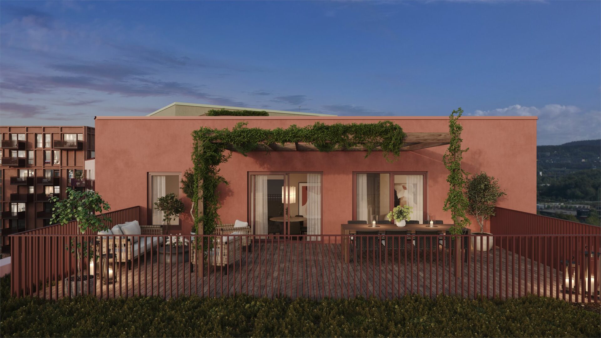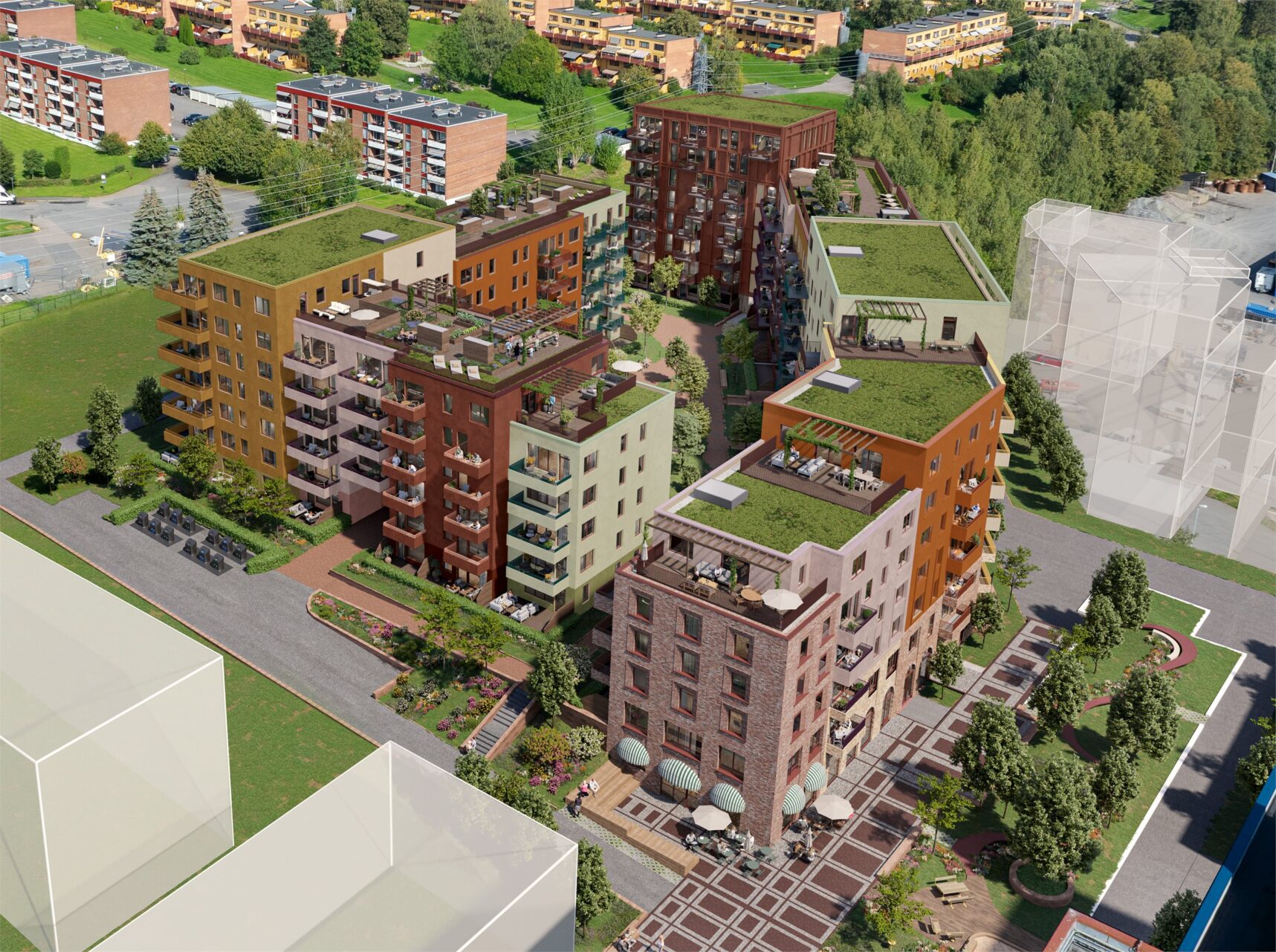 Her skapes et nytt nabolag, med moderne, urbane boliger omgitt av flotte uteområder i form av både gardsrom og felles takterrasser, som gjør hverdagen enkel og behagelig, både inne og ute. Du får et bredt servicetilbud, et trivelig torg, sosiale møteplasser, ny barnehage, flere kollektivforbindelser og bare 15 minutter med t-banen til Oslo S. I tillegg har du marka rett i nærheten.