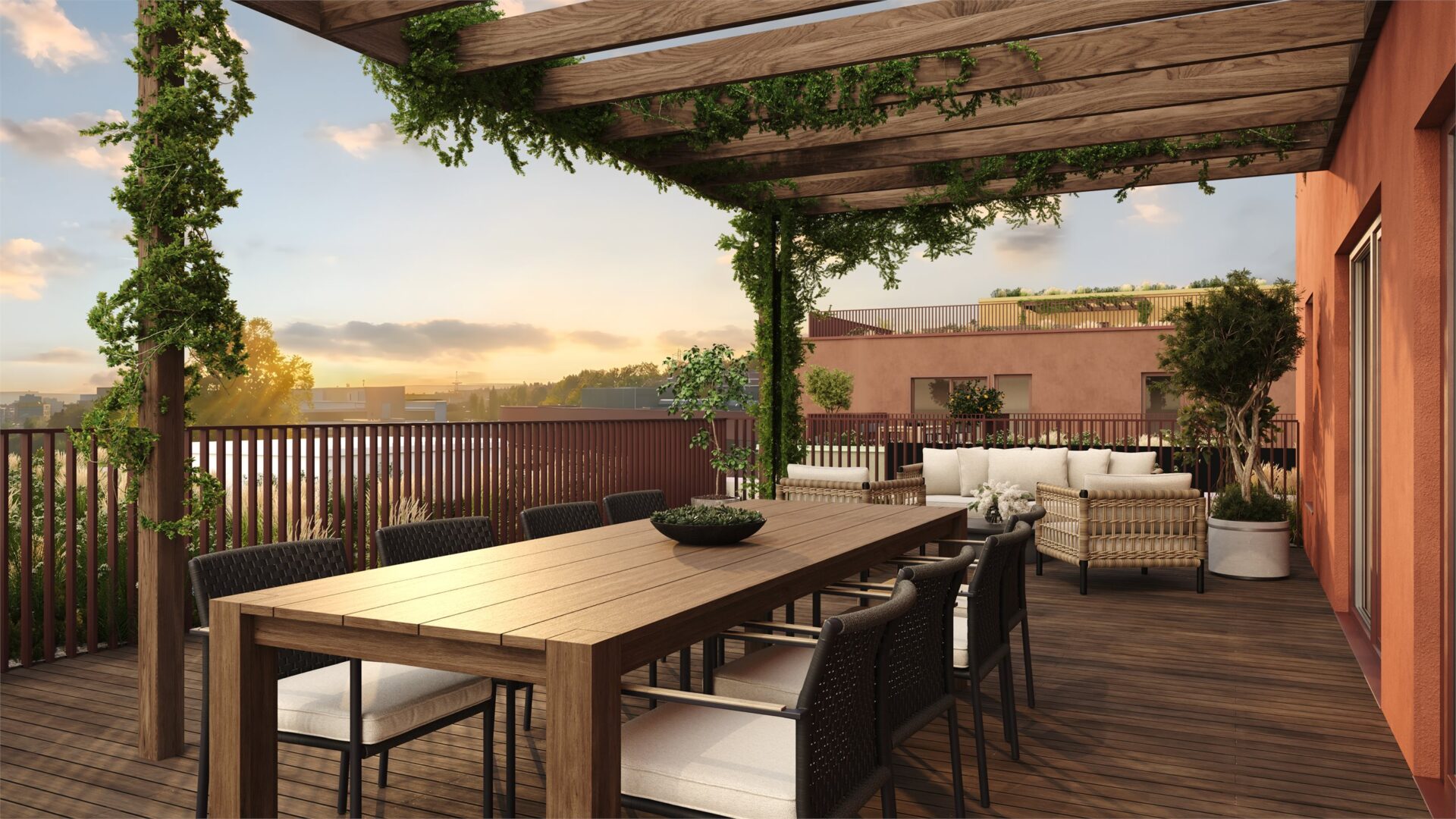 For leiligheter med privat takterrasse vil det bli levert dekker i betong og/ eller stål med tremmegulv. Balkongrekkverk blir enten med stålspiler eller tett, eller en kombinasjon av tett og spiler. Det vises til salgstegninger for plassering av private takterrasser.