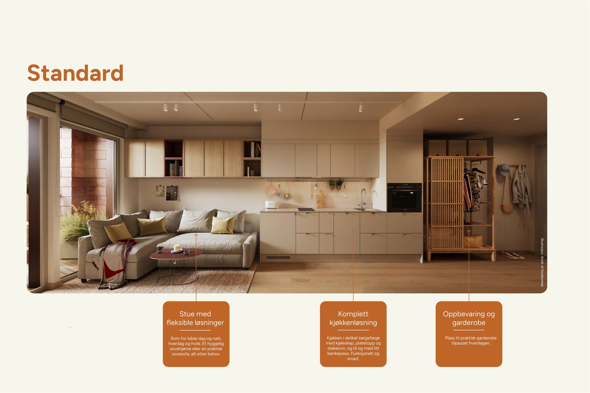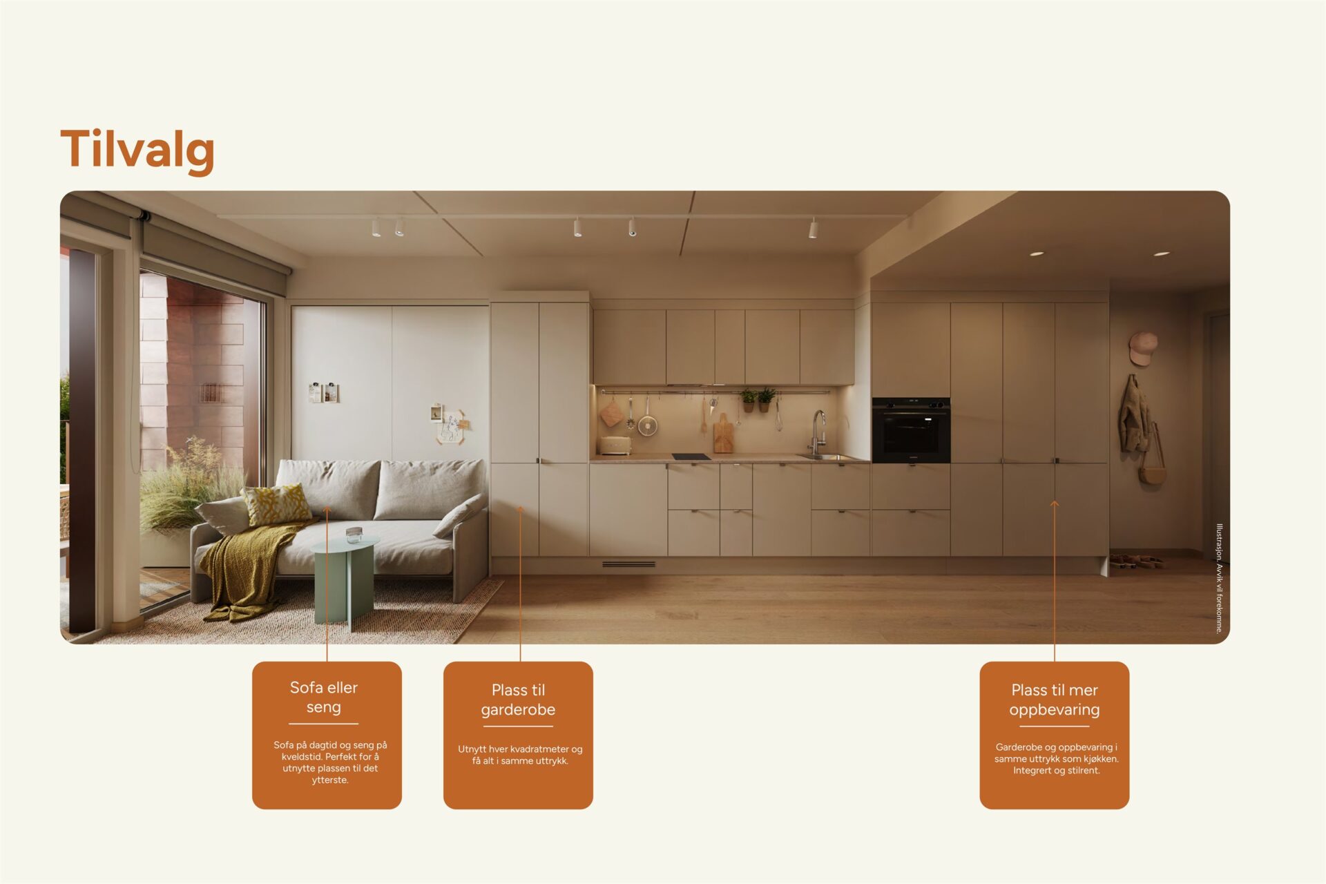 Kjøpere får anledning til å sette sitt personlige preg på leiligheten gjennom tilvalg. Kjøper vil få anledning til å gjøre tilvalg i henhold til prosjektets tilvalgsmeny mot tillegg i pris. Tilvalg gjøres gjennom en digital plattform. Alle leilighetskjøpere vil få mulighet til et personlig tilvalgsmøte med prosjektets kunderådgiver. Frist for bestilling av tilvalg er 22. mars 2026.