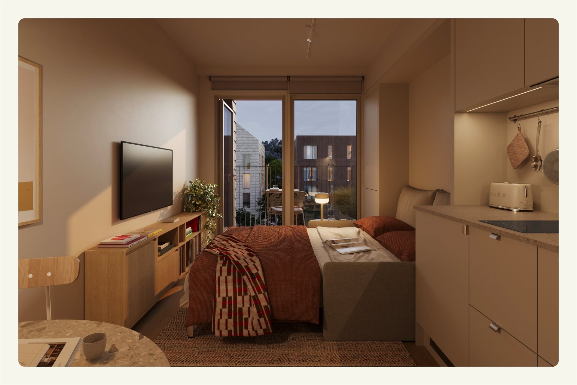 Studio Poulsson består av komplette 1-roms leiligheter på 20 til 25 m² med privat kjøkken/stue, bad og uteplass. Hver leilighet er utformet med smarte løsninger som utnytter arealet effektivt, samtidig som tilhørende delearealer gir deg ekstra rom når behovet oppstår. Resultatet er et selvstendig hjem med tilgang til mer – i et levende bomiljø i Poulssons Kvarter.