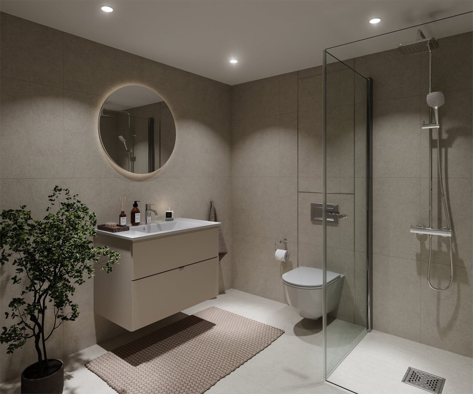 Alle leilighetene får gjennomgående god standard med vannbåren gulvvarme, balansert ventilasjon, HTH kjøkken med hvitevarer, plassbygde bad med fliser, temperert bod etc.