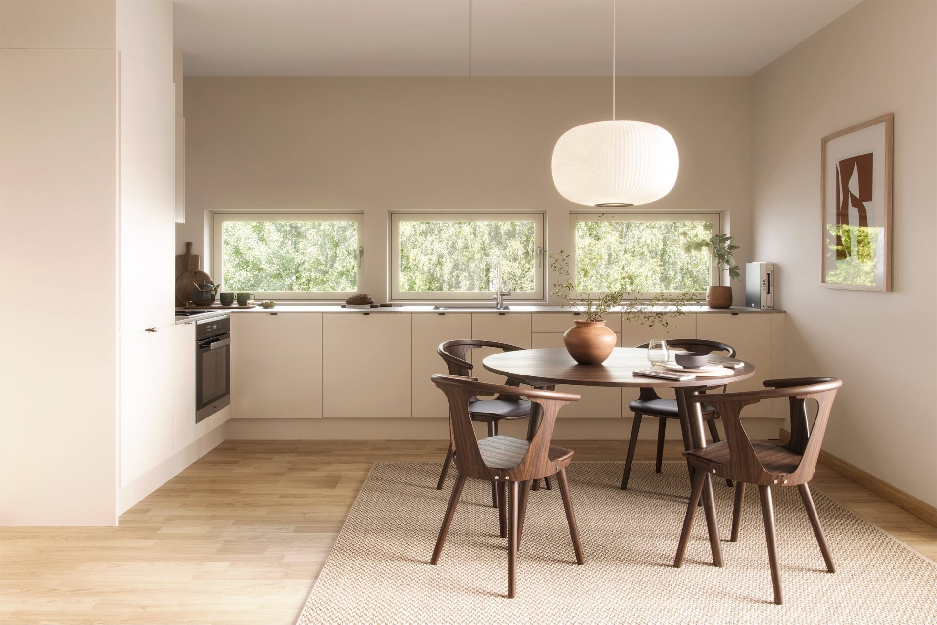 I leveransen får du kjøkken i en delikat beige farge med integrerte hvitevarer. Benkeplate i en mørkere jordtone. Fargepaletten skaper en rolig atmosfære du vil trives i. Utrykket på kjøkkenet gir deg muligheten til å tilpasse stilen fra det klassiske til det moderne. Armatur og øvrige detaljer i krom utførelse. Kjøkkenet leveres av Sigdal med helintegrerte hvitevarer fra Bosch.